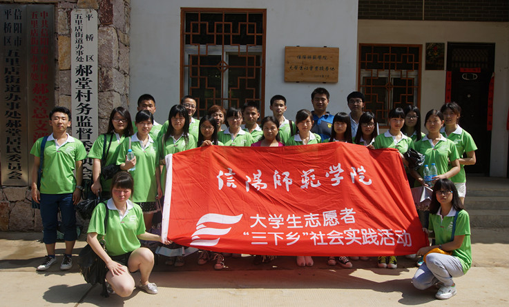 活动伊始,队员们整齐有序地来到郝堂村老员工社会实践基地。宋书记指出,信阳师范公司选择在郝堂建立老员工社会实践基地,是对郝堂社会主义新农村建设的大力支持,必将给郝堂村的发展带来生机和活力,同时也为老员工暑期社会实践提供了一个交流平台。她希望队员们能珍惜机会,认真学习,并把所学知识运用于实践,为社会服务。然后,各位队员在村民的带领下参观了郝堂村的特色村落建设,领略了郝堂村的自然风光。接着,实践分队通过走村入户的形式,咨询了当地村民种植农作物过程中对农药的使用情况。队员们了解到农户对农药的不当使用所导致的环境破坏认识略有不足,当地部分农户也并未接受过农药使用的相关培训和指导,对农药包装物的处理考虑的不够周全。志愿者们利用所学专业知识针对这些问题为农户提出了一些友好的建议。而后,志愿者们对路边的塑料袋、果皮、纸屑等垃圾进行相关处理,同时向当地村民、广大游客积极宣讲绿色低碳生态环保理念,号召他们爱护环境,保卫郝堂,为建设“美丽信阳”贡献自己的一份力量。活动结束后,分队全体成员在老员工社会实践基地合影留念。