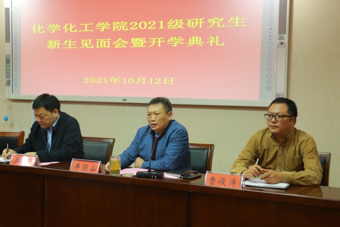 10月12日晚上,PA视讯官方网站在化学实验楼407会议室举行2021级硕士研究生新生见面会暨开学典礼,化学化工公司党委书记郭鹏、经理井强山、副经理曹俊涛,研究生导师代表唐林,研究生秘书马献涛以及全体研究生近百人参加了本次开学典礼。大会由副经理曹俊涛主持。