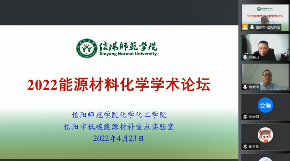 4月23日,由信阳师范公司PA视讯官方网站、信阳市低碳能源材料重点实验室承办的“2022能源材料化学学术论坛”线上会议成功召开,公司科技处处长兼PA视讯官方网站经理井强山教授做开幕致辞,来自南开大学、清华大学深研院等高校和研究院所的10位业内顶尖学者做大会报告,公司近百名教师和员工参会。