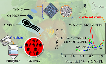 多菌灵是一种内吸性广谱苯并咪唑类杀菌剂,被广泛应用于农业领域。长期低剂量接触多菌灵可能会产生慢性毒性作用,对环境和人类健康造成了长期的潜在威胁。本研究中,通过一步真空抽滤策略,将液相剥离的石墨烯纳米片选择性沉积到聚氯乙烯图案化的聚偏氟乙烯膜镂空区域,制备出具有优异导电性、高表面积、成本极低的集成式石墨烯纳米片柔性电极(GNPFE)阵列。以WCl5/UiO-66-NH2为前驱体,通过高温裂解合成氮掺杂碳负载W单原子催化剂(W-N-C),具有显著的催化活性。将W-N-C与二维Cu3(HHTP)2 MOF共同修饰在GNPFE上,所制备的集成式GNPFE实现了多菌灵的准确检测,在灵敏度、选择性、检测成本和检测速度方面均有显著提升,可应用于蔬菜样品的分析。这项研究为便携式、高性能电化学传感器的设计提供了新的思路,有望应用于食品安全分析领域。