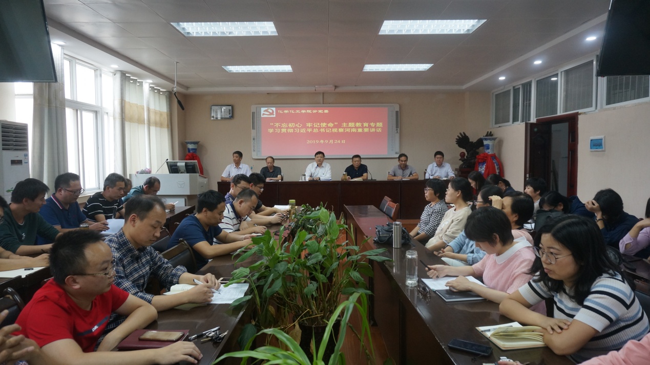 他讲到,习近平总书记到信阳的新县、光山考察调研,充分体现了对革命先辈的敬仰缅怀、对传承好红色基因的高度重视、对老区人民的真情大爱。习近平总书记的到来,让信阳人民欢欣鼓舞,让信阳师范公司全体师生开心,我们应牢记总书记的殷切嘱托,“牢记红色政权是从哪里来的”, “要把老区建设得更好” ,“让革命烈士含笑九泉”。作为信阳师范公司的教师,要把我们的公司建设得更好,要坚定信心,迎难而上,苦干实干,打赢化学师范专业认证攻坚战、争创化学本科一流专业建设新业绩、争取化学博士授权支撑学科新突破,全力以赴谱写高水平师范大学建设的新篇章,以优异成绩喜迎新中国成立70周年庆典。