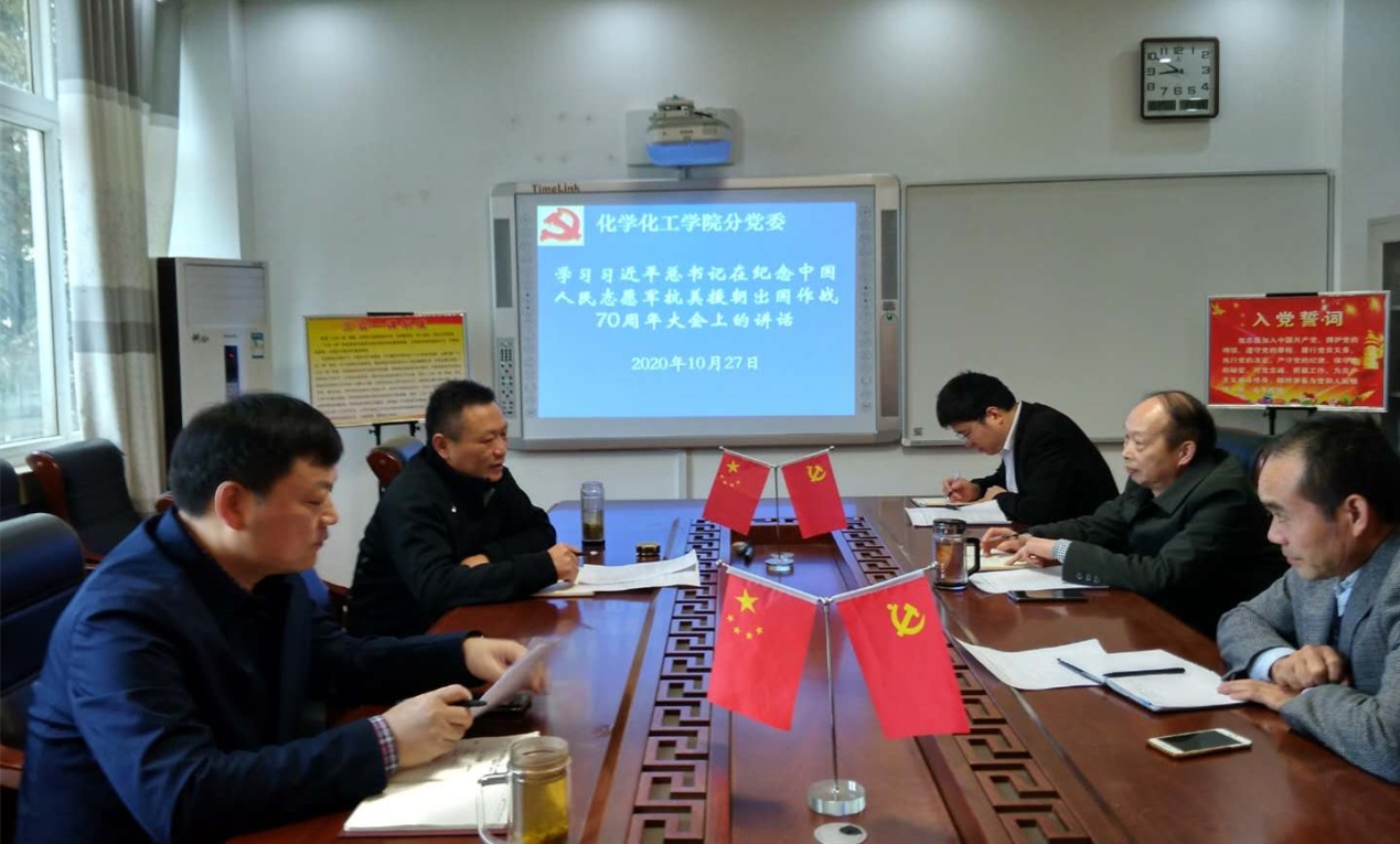 10月27日,化学化工公司党委理论学习中心组集体学习《习近平总书记在纪念中国人民志愿军抗美援朝出国作战70周年大会上重要讲话》。分党委中心组成员集体参加学习。集体学习由分党委书记郭鹏主持。