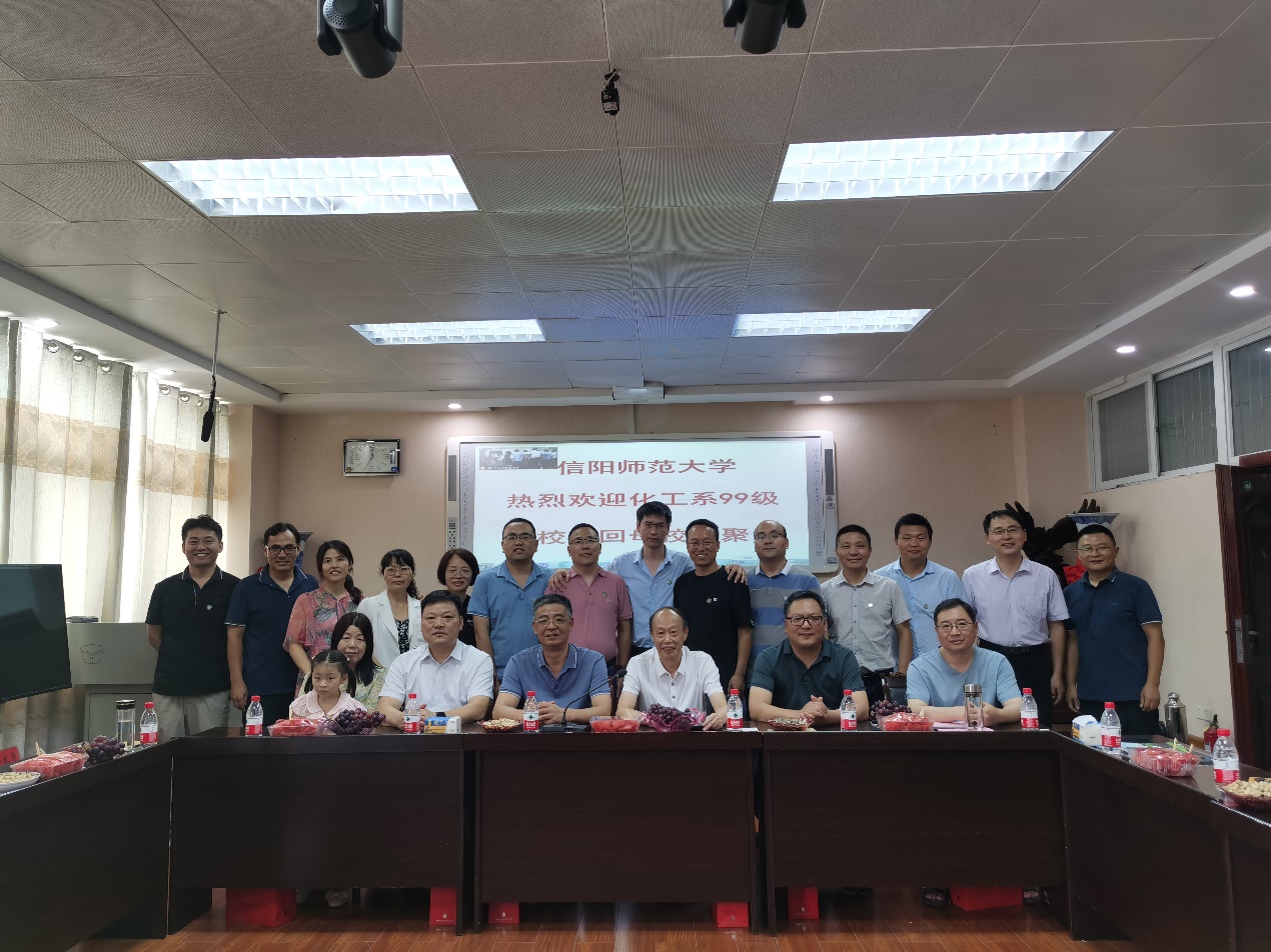 2023年8月12日,值此信阳师范学大学更名揭牌庆典喜乐氛围中,PA视讯官方网站1999级化工本科班员工荣返母校,开展毕业20年师生座谈交流活动。