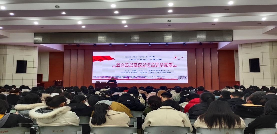 11月28日,化学化工公司党委书记郭鹏在逸夫楼报告厅为员工党员、团学干部、各班团负责人、2020级全体作“深入学习习近平外交思想”专题《形势与政策》讲座。