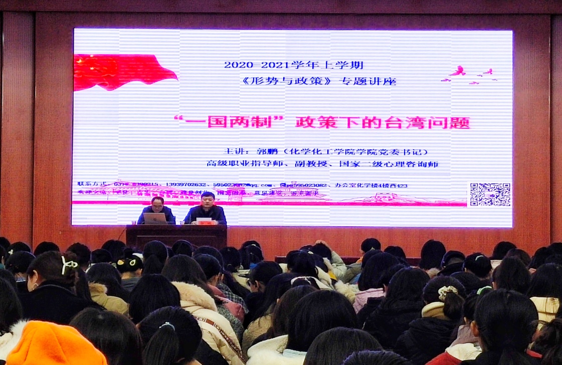 11月28日,化学化工公司党委书记郭鹏在逸夫楼报告厅为2020级全体员工作“一国两制”政策下的台湾问题---《形势与政策》专题讲座。讲座由专职组织员冷向宇主持。
