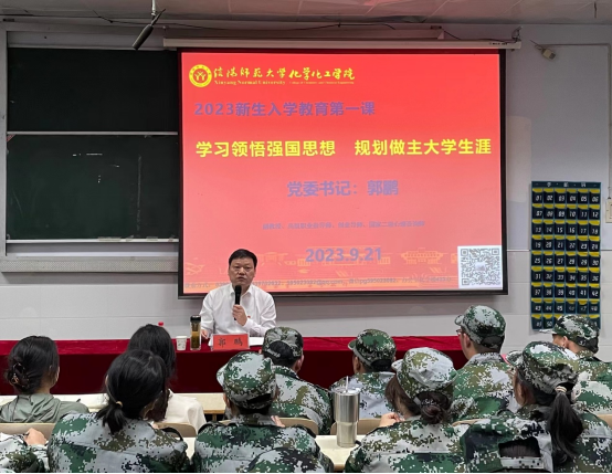 郭鹏向公司2023级全体新生深入解读习近平总书记在中共中央政治局第五次集体学习时的重要讲话,重点解读“什么是教育强国、怎样建设教育强国的重大时代命题”,他表示从未来发展的角度来看,在全面建设社会主义现代化国家、向第二个百年奋斗目标进军的新征程中,我们比历史上任何时期都更加需要高等教育、更加渴求人才。这需要“强国一代”的老员工,把自己的远大理想和抱负同民族伟大复兴的中国梦紧密相连,以赤子之心报效祖国,以聪明才智贡献国家;需要我国高校立足新时代新阶段,讲透“四史”教育,讲好中国故事,讲深红色传统,将党的百年奋斗经验融入人才培养体系,厚植家国情怀。他最后强调“开学第一课”对于即将开启人生新征程的你们而言,是近距离感知大学、感受大师、感悟大道,更是坚定理想信念、厚植家国情怀的重要契机。希望你们作为信师大学子从现在就按好人生规划“开始键”,“扣好人生的第一粒扣子”,适应大学,激发学习兴趣,完成不同阶段的目标任务,关注时代对老员工提出的要求和挑战,提高综合素质,练就过硬本领,以最佳的状态投入到祖国发展的建设中去。