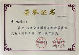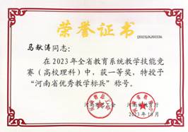 近日,河南省总工会、河南省教育厅公布了河南省教育系统2023年度教学技能竞赛获奖名单(豫工文[2023] 107号),PA视讯官方网站遴选的青年教师马献涛博士、李超博士分别获得理科组一等奖、工科组二等奖。其中,马献涛博士顺利晋级现场决赛,取得理科组第7名的好成绩,同时被授予“河南省优秀教学标兵”荣誉称号。