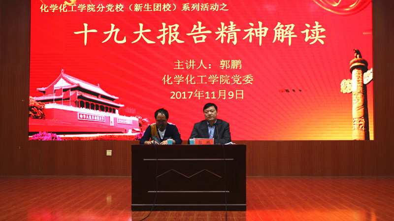 11月9日,化学化工公司党委书记郭鹏在逸夫楼报告厅与该院2016、2017级员工座谈交流,为大家深度解读十九大精神。