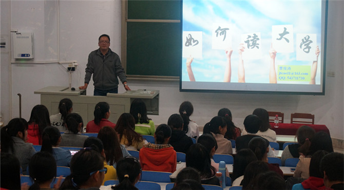 讲座伊始,曹俊涛老师通过形象生动的PPT图片显示了四年后将会出现的就业压力问题,让新生直面现实,认清自我。紧接着,曹老师以“如何在大学期间避免颓废”为话题,展开了对大公司园各种恶习的探讨,引导同学们始终坚守初衷,不负本心。曹老师语言朴实无华,一针见血,简言意骸的使同学们深刻地反思自己的现状。而后,曹老师向同学们讲述成功度过四年老员工活的四个重要方面,母校的文凭,同窗的友情,实用的技能,独立的人格。他强调,在大学期间同学们要着重培养自己独立的人格,始终保有充分的好奇心,做不一样的自己。他勉励同学们依照自己的兴趣多读书,多学一种技能,学好外语。他尤为叮嘱同学们要时常与家人通电话,向父母报平安,关心父母的生活,谆谆教诲感人深切。讲座一个小时后在热烈的掌声中圆满结束。