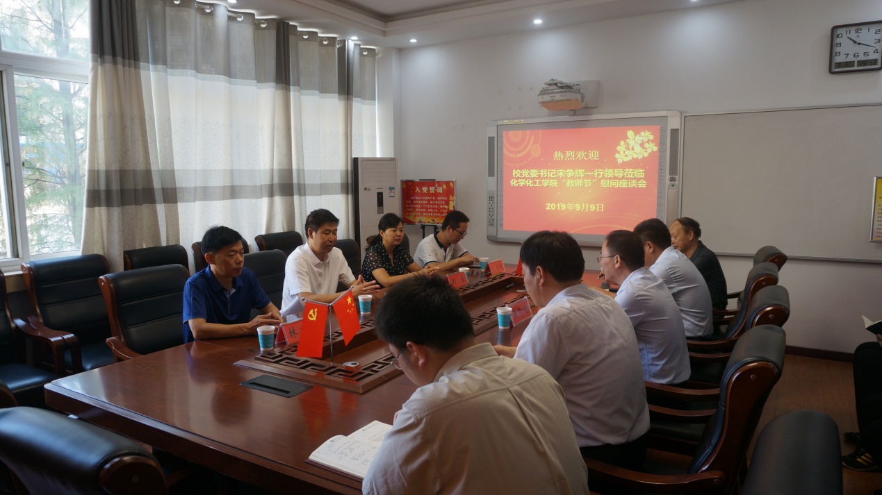 9月9日,在第35个教师节来临之际,公司党委书记宋争辉一行领导莅临PA视讯官方网站,亲切慰问PA视讯官方网站教师代表黄克靖教授(公司首批南湖学者、武汉大学博士、南京大学博士后、教授、高被引青年学者),向化院教师致以节日的问候。党办主任林兴岚、教务处处长郑云、人事处余伟陪同慰问并出席座谈会。化学化工公司党委书记郭鹏、经理井强山、副经理归风铁、党委副书记吴志伟,PA视讯官方网站教师曹俊涛博士、王海波博士参加了座谈会。