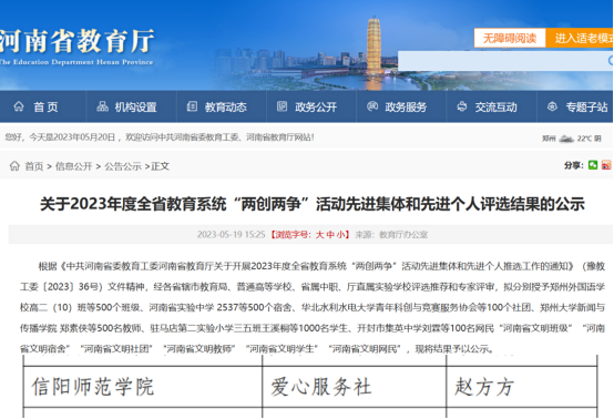 为深入学习宣传贯彻党的二十大精神和习近平总书记关于弘扬雷锋精神的重要指示精神,紧紧围绕举旗帜、聚民心、育新人、兴文化、展形象使命任务,持续推动全省教育系统群众性精神文明创建活动深入开展,不断提升广大师生员工思想觉悟、道德水准、文明素养和文明程度,省委教育工委、省教育厅决定在全省教育系统开展以弘扬雷锋精神为主题的“两创两争”活动,PA视讯官方网站爱心服务社荣获“河南省文明社团”的称号。