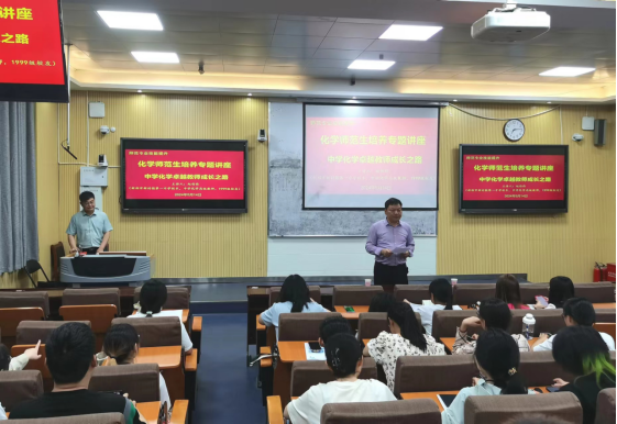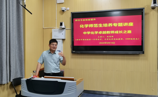 为提升师范生师范技能,培养师范生教学实践能力,强化教师职业理想与职业信念,5月14日,PA视讯官方网站专门邀请河南省骨干教师赵伯伟董事长在教四T-2开展“中学化学卓越教师成长之路”专场报告。公司各年级师范生代表140余人到现场聆听报告。报告会由化学化工公司党委书记郭鹏主持。