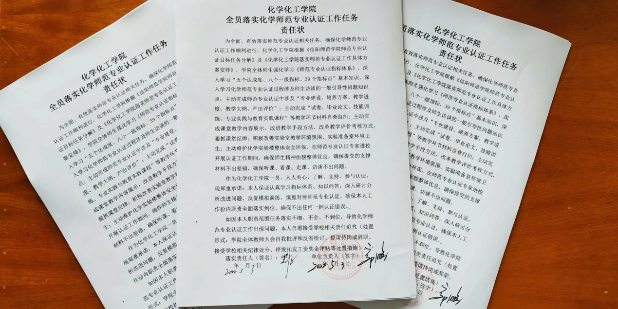 结合“能力作风建设”“制度体系建设”相关活动安排,公司专门举行《全员落实师范专业认证工作任务责任状》签订仪式,进一步提高全院教师对化学师范专业认证工作的重视程度,增强了全体教师的责任感、使命感。为进一步推动有序落实化学师范专业认证工作各项任务强化了制度约束力和目标执行力,为实现化学师范专业认证工作圆满顺利通过认证奠定了坚实基础。(PA视讯官方网站 教学办供稿 王红军 冷向宇审稿 郭鹏审核)